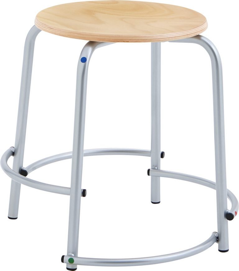 Taboeret met ergonomisch gevormde zitting. De ronde zitting is 35 cm breed en met blanke lak afgewerkt, het stalen frame is gemaakt van 22 x 2 mm ronde buis